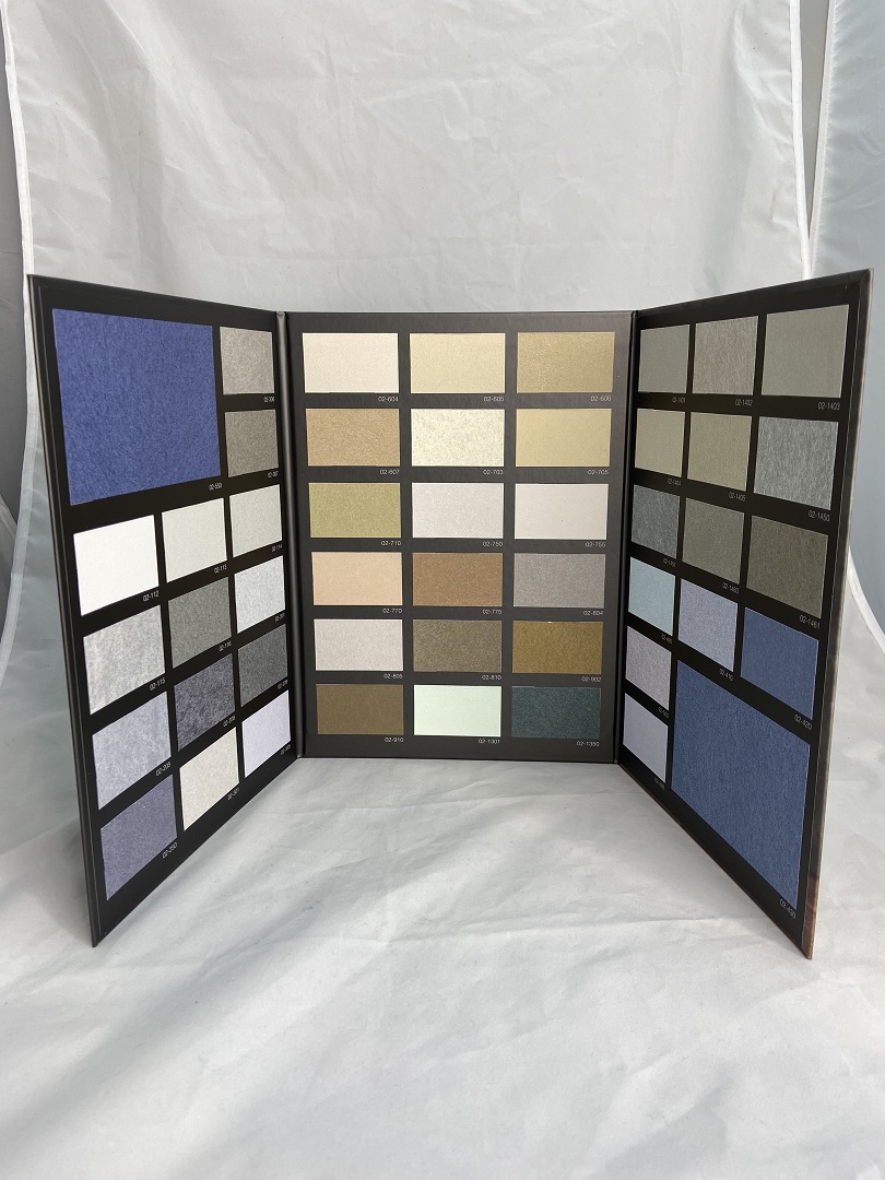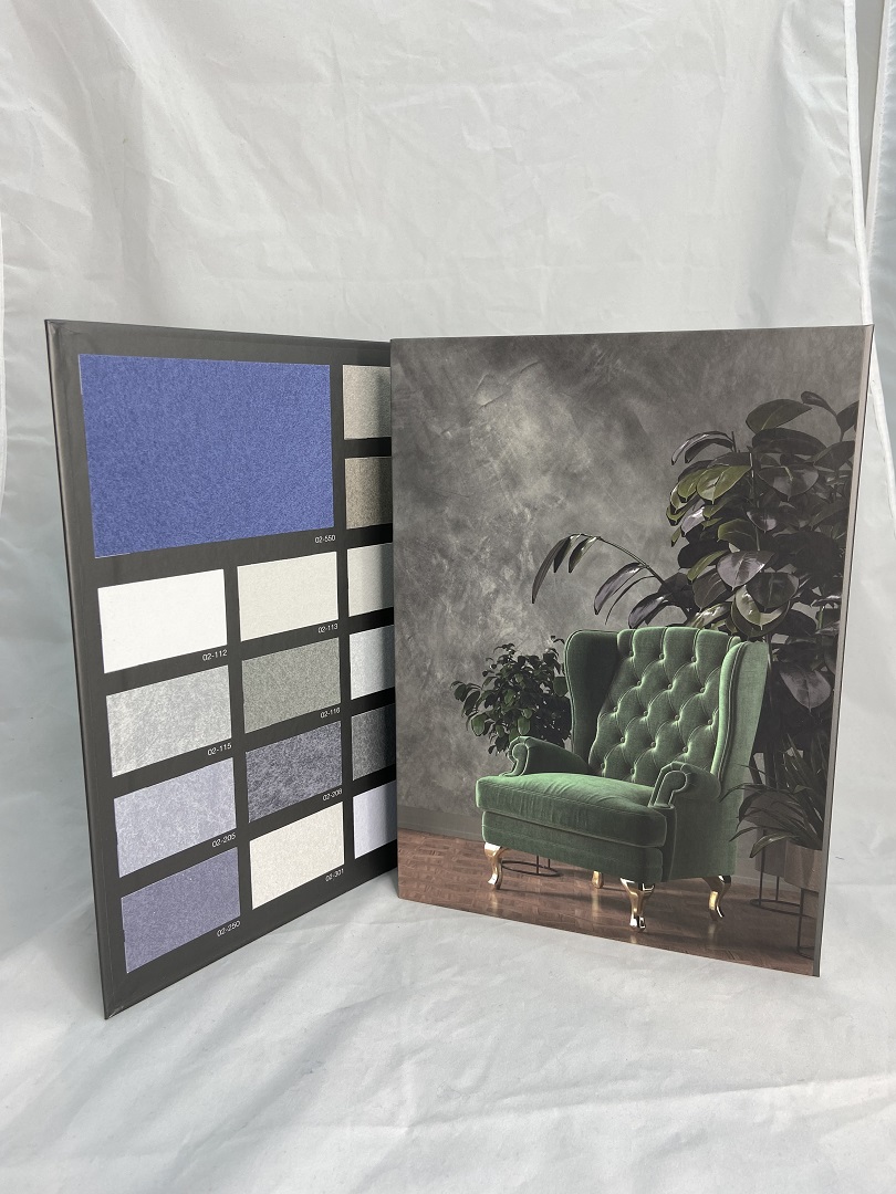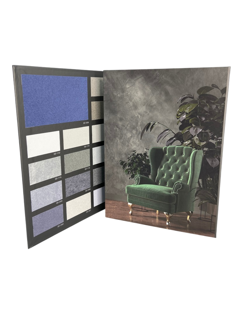 Каждый образец снабжён уникальным кодом и визуальным примером нанесения, что позволяет точно подобрать оттенок под конкретный интерьер.