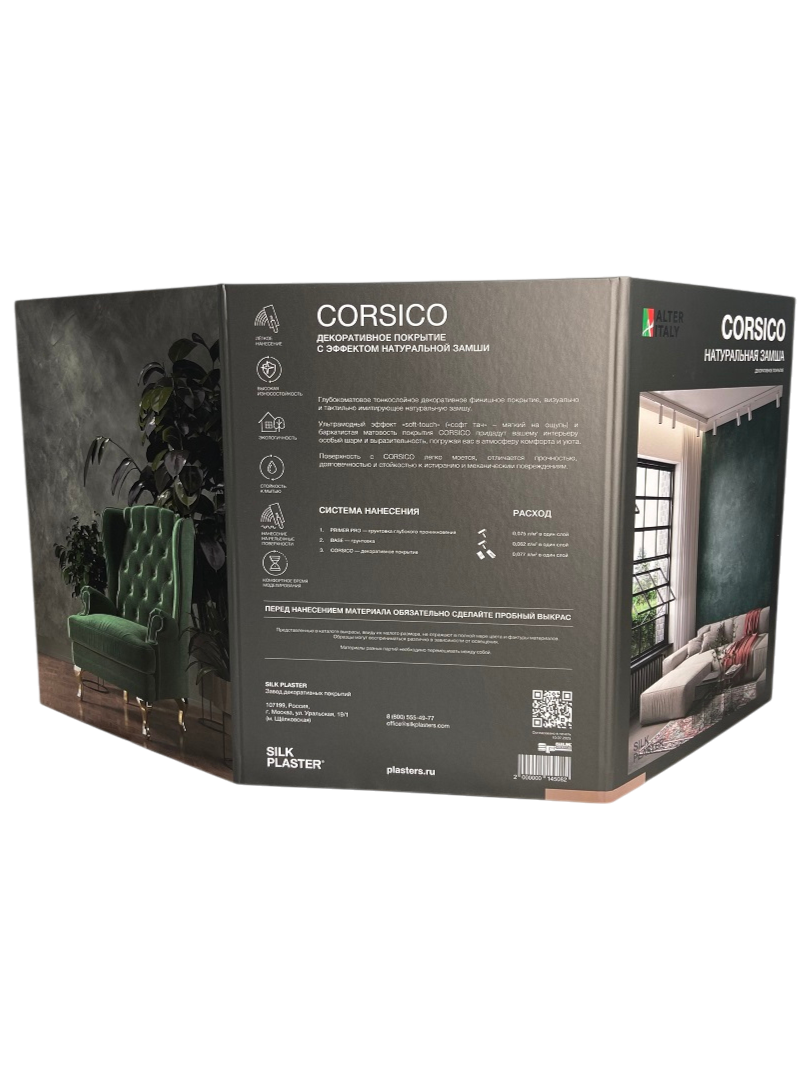 Коллекция Corsico от бренда AlterItaly — это декоративное покрытие с эффектом натуральной замши, сочетающее в себе эстетическую мягкость и практичность. Поверхность, выполненная в технике Corsico, обладает деликатной бархатистой текстурой и матовым финишем, придавая интерьеру уют и утонченность.