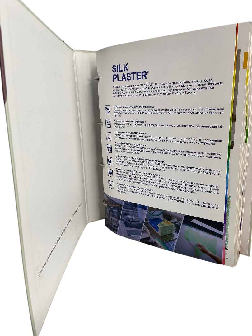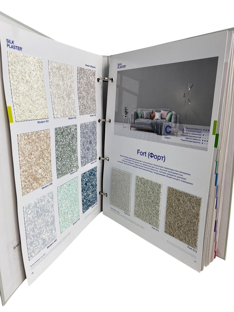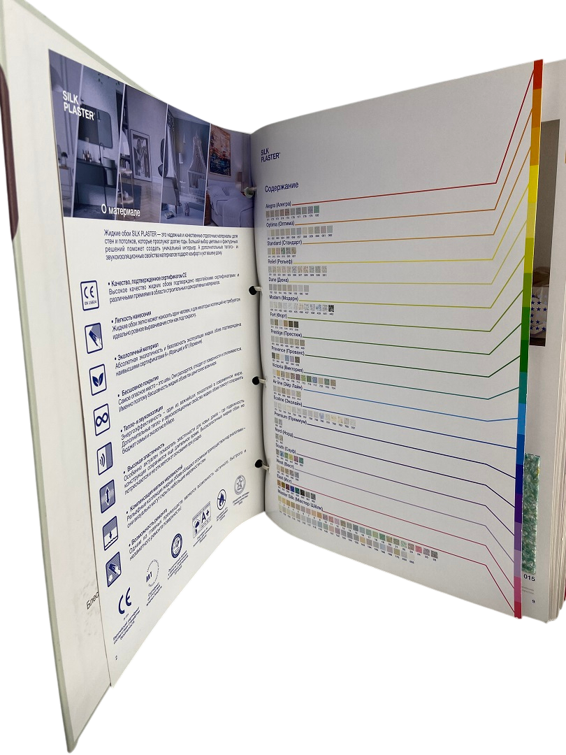 Каталог на кольцах с натуральными образцами жидких обоев из 18 коллекций Основной серии Silk Plaster. Включает содержание и лист с сопутствующими товарами. Удобен для подбора и демонстрации материалов.