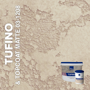 Фактурная декоративная штукатурка TUFINO на известковой основе с натуральным мраморным среднезернистым наполнителем предназначена для создания покрытий с эффектами травертина, известняка, микроцемента, оштукатуренной стены и другими. Материал на водной основе, без запаха, безопасен для людей и окружающей среды. В комплексе с защитным покрытием Topcoat MATTE штукатурка TUFINO создает влагостойкое, неприхотливое в эксплуатации, долговечное покрытие.