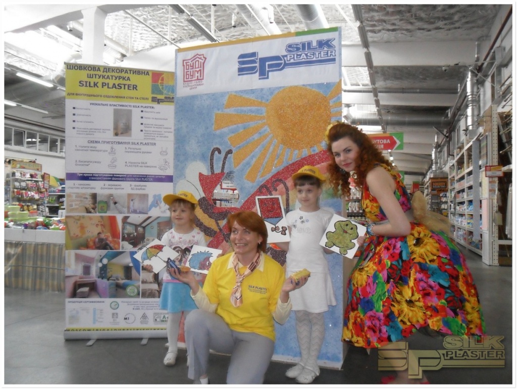 1 июня в Киеве, в отделе шелковых штукатурок SILK PLASTER, на территории строительного супермаркета «Буди Бум», прошел праздник для детей и взрослых. Отдел жидких обоев SILK PLASTER украсили шариками, весь день играла весёлая детская музыка, работали аниматоры.