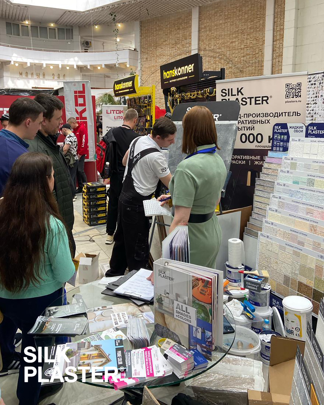 Огромной популярностью пользуются мастер-классы от наших ТОП мастеров-декораторов. Желающих протестировать нанесение материалов SILK PLASTER оказалось настолько много, что образовывались очереди, – но никто не остался без индивидуального мастер-класса!