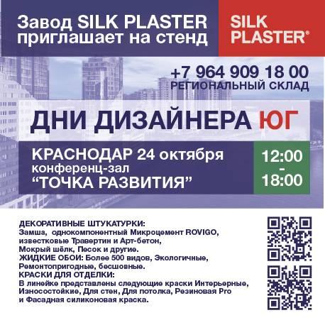 Завод-производитель SILK PLASTER приглашает вас на выставку «ДНИ ДИЗАЙНЕРА ЮГ», который пройдет 24 октября с 12:00 до 18:00 в г. Краснодар.