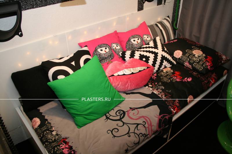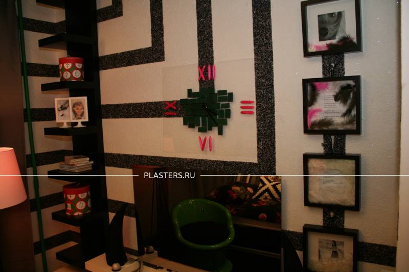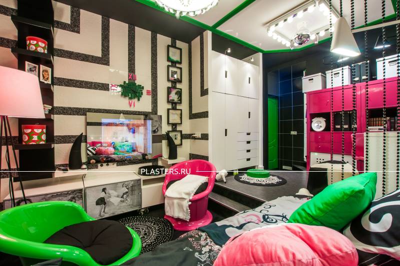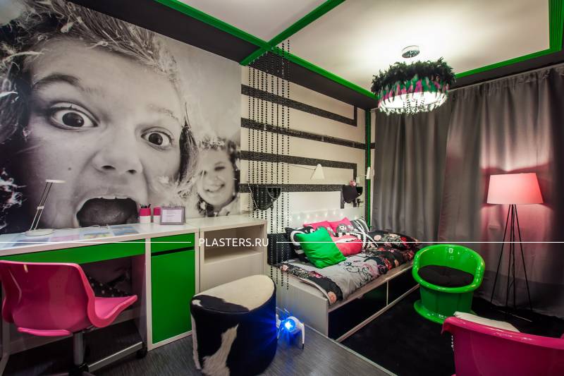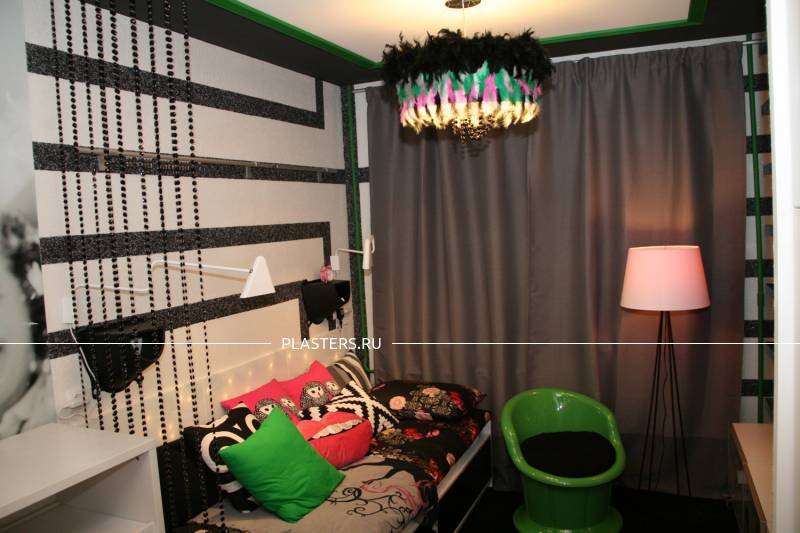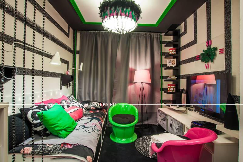 С помощью жидких обоев SILK PLASTER дизайнеры программ воплотили в жизнь много креативных идей и преобразили интерьеры многих комнат – таких, как спальня, детская, комната для подростка, рабочий кабинет и т.д. Как Вы думаете, легко ли угодить маленькой поклоннице рок-музыки и сделать комнату, с одной стороны – во взрослом стиле, а с другой – веселую и нескучную? Задача, конечно, непростая, но с жидкими обоями SILK PLASTER всё возможно! Дизайнеры программы соединили 2 вида шелковой штукатурки ("ВИКТОРИЯ № 701" - белый цвет и "ИСТ № 960" - черный цвет) в геометрический узор, дизайн стен получился с одной стороны в монохромной гамме, как и хотела хозяйка комнаты, а с другой – интересным, живым и динамичным. А так как это шелковая штукатурка с добавлением блесток, то получилась еще и приятная фактура с мерцанием.
