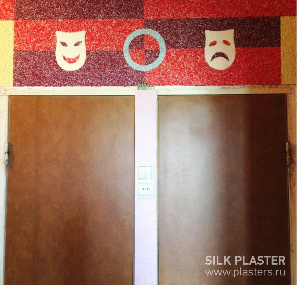 Маски на другой стене символизируют два основных эмоциональных состояния человека – грусть и радость, и судя по яркому и необычному сочетанию цветов штукатурки SILK PLASTER, можно сделать вывод, что в этом доме преобладает состояние радости и веселья! А ведь именно это так необходимо детям для счастливого детства и интересной жизни! Спасибо SILK PLASTER за это!