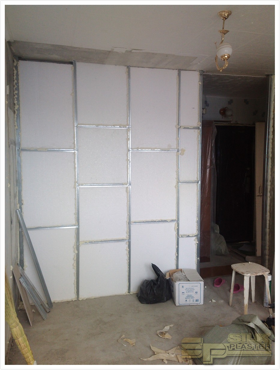 Изучив особенности материала (учитывая его жидкую составляющую – воду), тщательно подготовили стены к нанесению. Прошлись грунтовкой по всем поверхностям – нанесли слой, просушили часа 3-4, затем нанесли следующий. Так как вновь созданная стена содержала металлические направляющие, её обработали и третьим слоем грунтовки для надёжности, чтобы не вылезли потом какие-нибудь неожиданные желтые пятна от металла в стене - шёлковая штукатурка для отделки была выбрана достаточно светлая и любые неожиданности были бы очень заметны. Понравилось, что с фирменной грунтовкой SILK PLASTER смогли сэкономить и время, и деньги. Не надо отдельно грунтовать, потом отдельно красить – всё в одном флаконе, очень удобно.