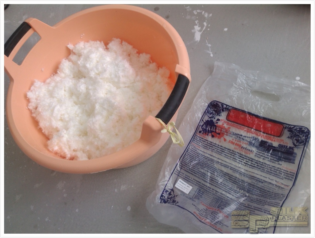 Затем подготовили сухую штукатурку к работе: высыпали в ёмкость с водой блёстки, размешали, встряхнули содержимое пакета со штукатуркой и добавили всё это в ту же ёмкость. Тщательно всё размешали руками до однородного состояния, сложили снова в упаковочные пакеты, закрыли их и оставили выдерживаться на 12 часов.