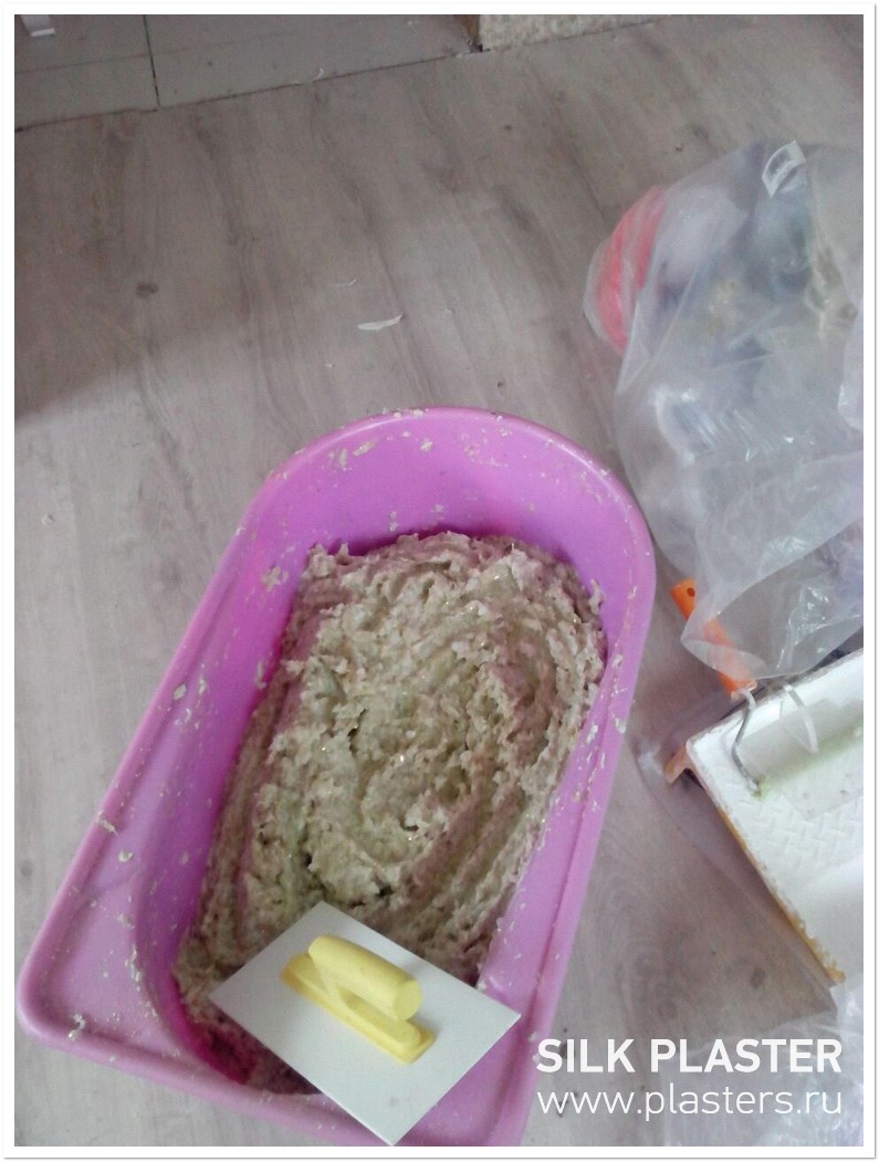 Подготовка обоев простая: в воду комнатной температуры (количество воды указано на пакете с обоями) высыпали сухую смесь из пакета и тщательно (чтобы не осталось комочков) перемешали. Замешивать обои понравилось – нет неприятных запахов, да и сама масса тёпленькая и приятная на ошупь (сразу детство вспомнилось, вот бы из неё было классно фигурки лепить)). Затем уже готовую смесь снова в её родной пакет складываем и замешиваем следующий. Когда все пакеты были замешаны, оставили их на 12 часов настаиваться (чтобы всё равномерно пропиталось).