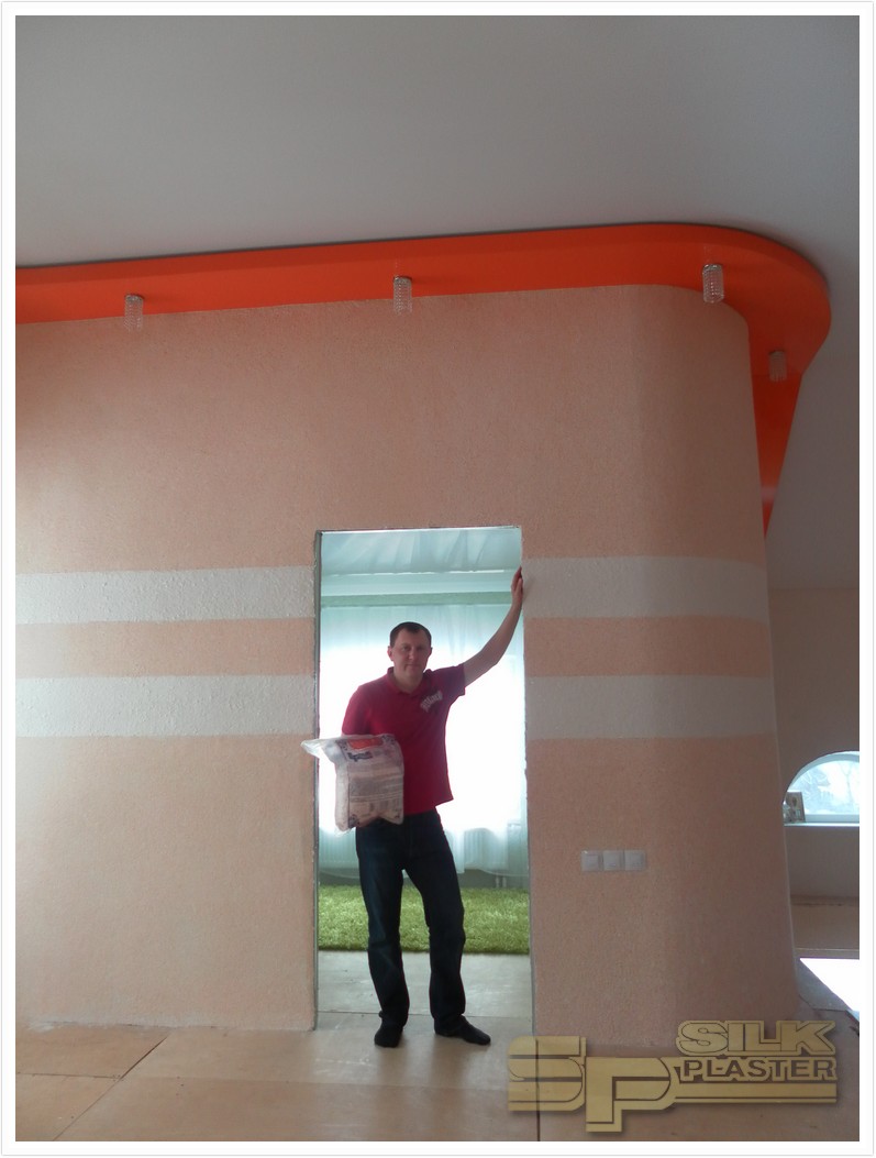 Сейчас мы начинаем внутреннюю отделку второго этажа и уже определились с отделкой стен зала второго этажа. Мы решили его декорировать двумя видами шелковой декоративной штукатурки SILK PLASTER Ecodecor 108 и Victoria 701. Здесь решение в пользу данного вида штукатурки было принято очень быстро, без обсуждений других вариантов отделки, так как стены здесь оригинально-изогнутые плавными линиями и ничего лучше, чем данный вид материала, чтобы скрыть небольшие дефекты этих стен мы не нашли. Это идеальный, можно сказать универсальный материал и вид отделки для сложных геометрических форм комнат. В конечном итоге мы хотим получить яркий, стильный, выразительный интерьер с помощью шелковой штукатурки SILK PLASTER.