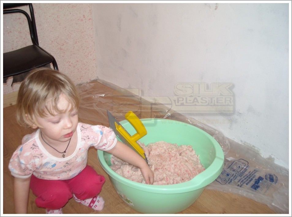 Немного помучившись с перемешивание такого разнообразия, и загрунтовав стены, приступили к нанесению обоев. На первой стене после высыхания вылезли маленькие желтые пятна, немного почитав, стало ясно, что это из-за торчавших арматурин плиты. Решилось все очень просто - вырезав квадратик пожелтевших обоев, закрасил эти места белой алкидной эмалью. На следующий день нанес на эти места кусочки жидких обоев. После высыхания долго искали эти места, совершенно ничего не видно. У нас маленький ребенок и это однозначно большой плюс, в одной комнате она нам уже нарисовала свои картины Павла Пикассо. Теперь в этой комнате можно просто вырезать старые и нанести новые! Кстати дочке очень понравилось принимать участие в ремонте. Никаких швов! Розетки с выключателями вырезать не надо! Идеально ровная граница с потолком получилась.
