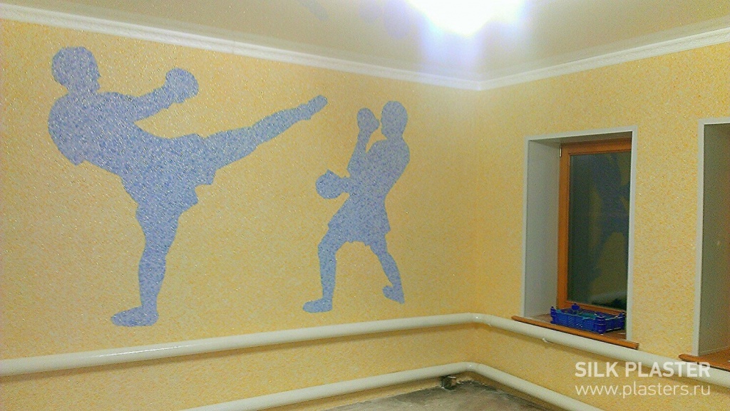 Решение пришло внезапно, как и всегда в таких случаях: ЖИДКИЕ ОБОИ! И чем больше я углублялась в изучение этой темы, тем больше мне это решение нравилось. Я увидела только плюсы, посудите сами: швов никаких нет, наносятся быстрей и проще обычных обоев, можно снять и поклеить в другую комнату, если приестся, нигде не отклеиваются (от сквозняка,например) и, что самое главное, позволяют проявить себя как художника! Например, сын у нас не первый год занимается кикбоксом. Как выразить это в его комнате, помимо висящей груши? Да легко! Смотрите фото =).