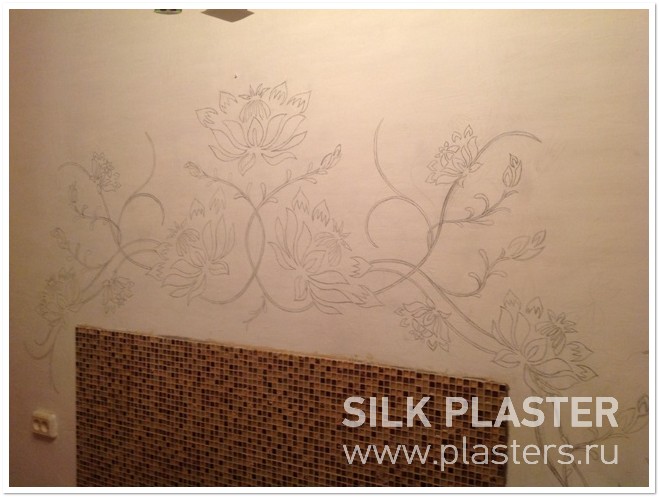 В кухне уже решила нарисовать красивый, ажурный цветочный рисунок. Для этого я использовала 2 цвета: бутоны Сауф 949 , а стебельки и листики Прованс 048. Общий фон - это Экодекор 107