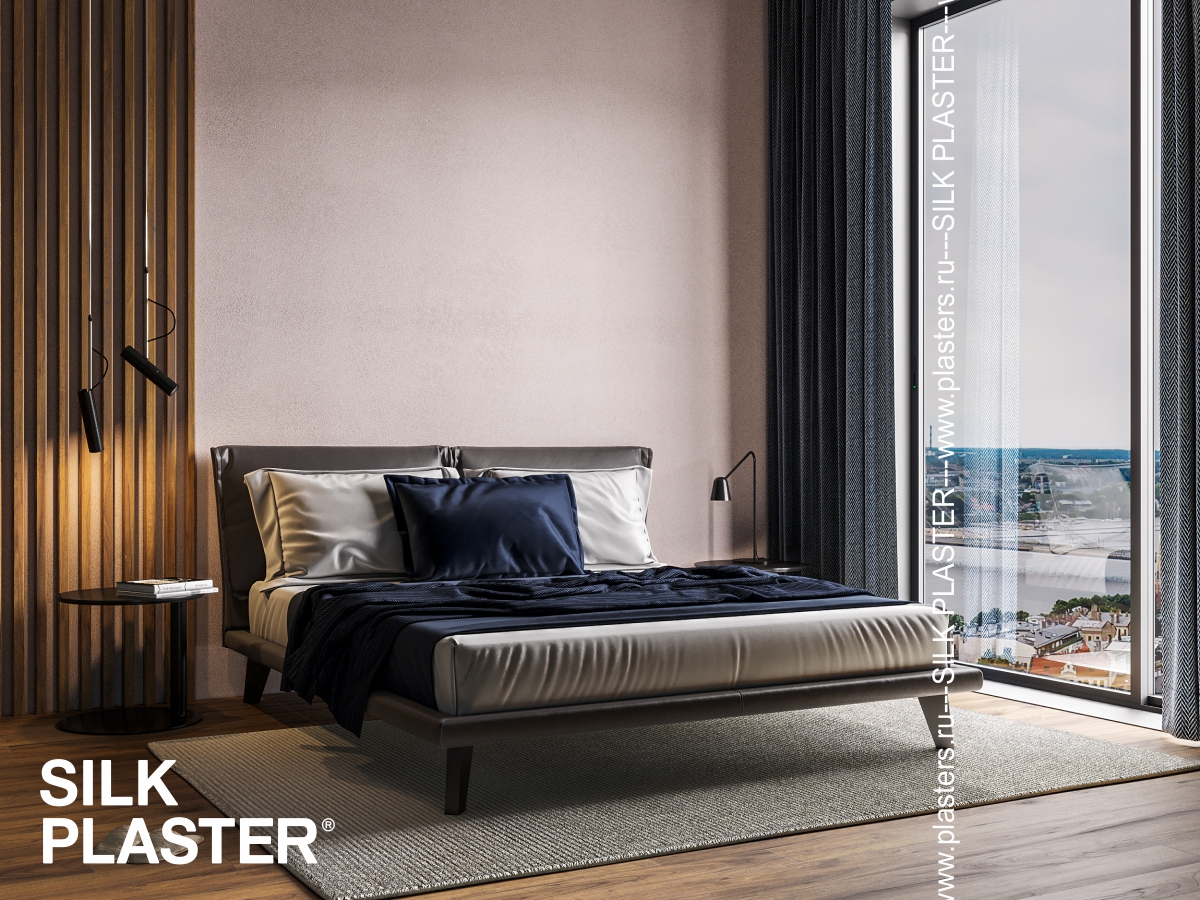 Если для отделки акцентной стены в спальне используются жидкие обои и шелковые декоративные штукатурки SILK PLASTER и Victoria du Monde, дополните их подсветкой, которая подчеркнет фактуру и блеск материала.