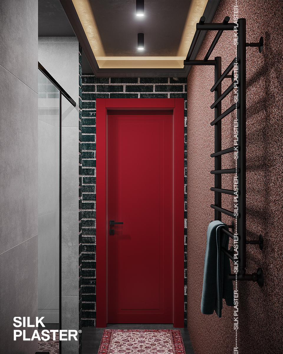 - декоративная штукатурка Mixart 035 холодного красного цвета на стене с полотенцесушителем.