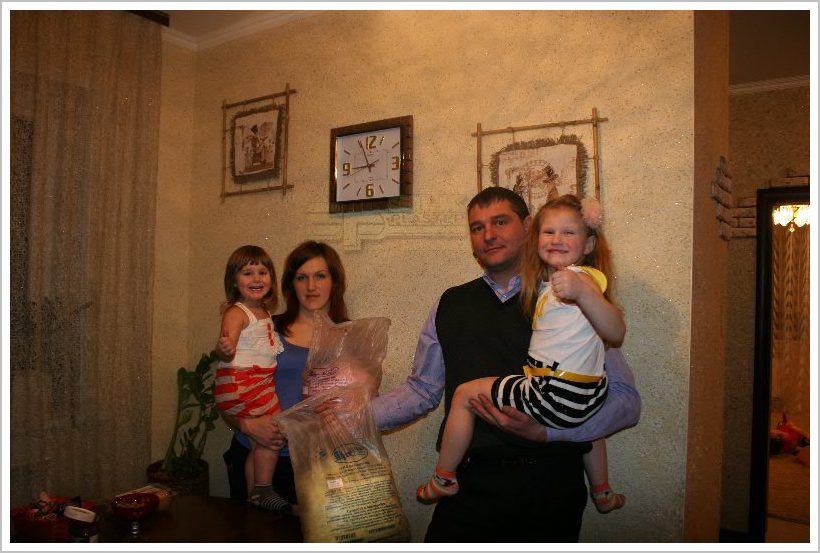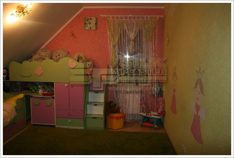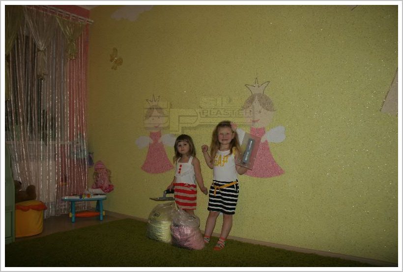 Ремонт начали с детской комнаты (выбор расцветки обоев оставили за нашими девочками: Ариша и Маша), остановились на ярко розово-салатовом цвете (да еще и блеск добавили). Когда три стены комнаты были готовы, тогда начала думать о каком- нибудь рисунке на свободной стене. Получилось отлично, и главное, в тему : Две принцессы (наши девочки) всегда счастливые вдвоем под ярким солнышком! (Ну по Фэн-Шую). Эти «аппликации» были созданы из остатков разных жидких обоев Silk Plasters (остатки от других комнат), украшенных аксессуарами из магазина тканей! Работа была очень увлекательна, как для меня, так и для моих детей (они месили обои в воде). Процесс нанесения занял 2 дня и плюс рисунок 1,5 дня. Потом настала пора покупать мебель, отталкивались от цвета жидких обоев Silk Plaster …люстра… шторы… бабочки… Получилось просто волшебно!! Дети в восторге! Да и гости тоже.