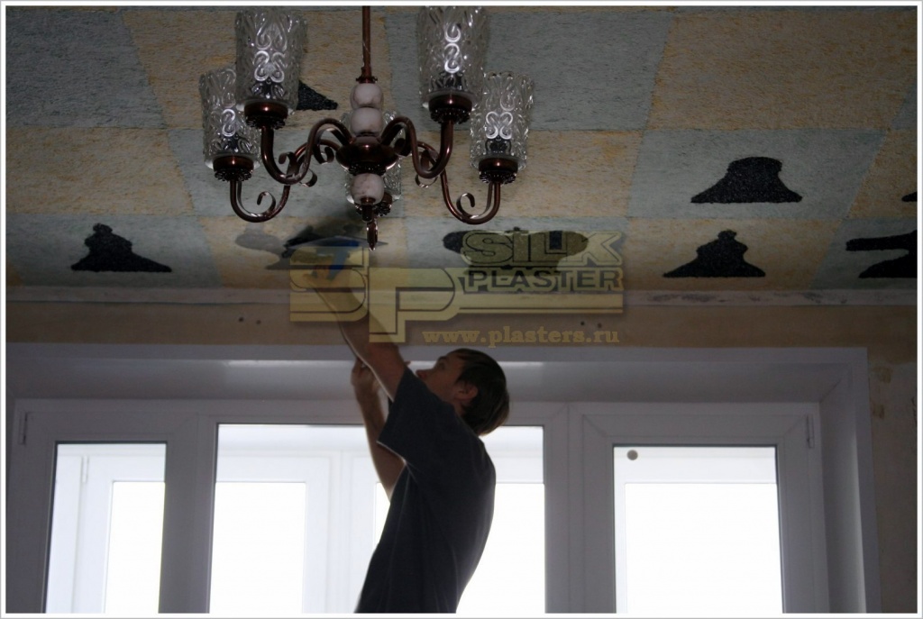 В качестве темы проекта была выбрана шахматная доска с фигурами. На эту идею натолкнул квадратный потолок с несимметричным относительно люстры швом. Третья из линий клеток как раз могла бы проходить через соединение плит, однако здесь мы просчитались... Замеры с рулеткой показали, что линии не совпадают, и придется прятать шов под шелковой декоративной штукатуркой «SILK PLASTER», с чем она успешно справилась. Кстати, разметка мелом загрунтованной поверхности - не самое удачное решение: быстро стирается, да и не так ровно получаются клетки. Потратив время на это, пришлось переделывать всё заново с помощью белых нитей (для контраста с тёмным потолком), равномерно натянутых вдоль и поперёк.