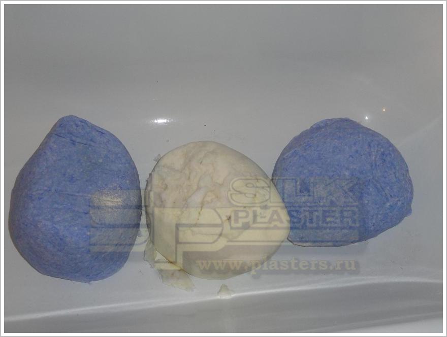 При выборе цвета остановились на светло синих оттенках. Купили два вида (это Эконом 001 – белый, Блеск 043 – светло синий) шелковой декоративной штукатурки SILK PLASTER. Для основного фона мы смешивали белый (Эконом) и светло синий (Блеск).