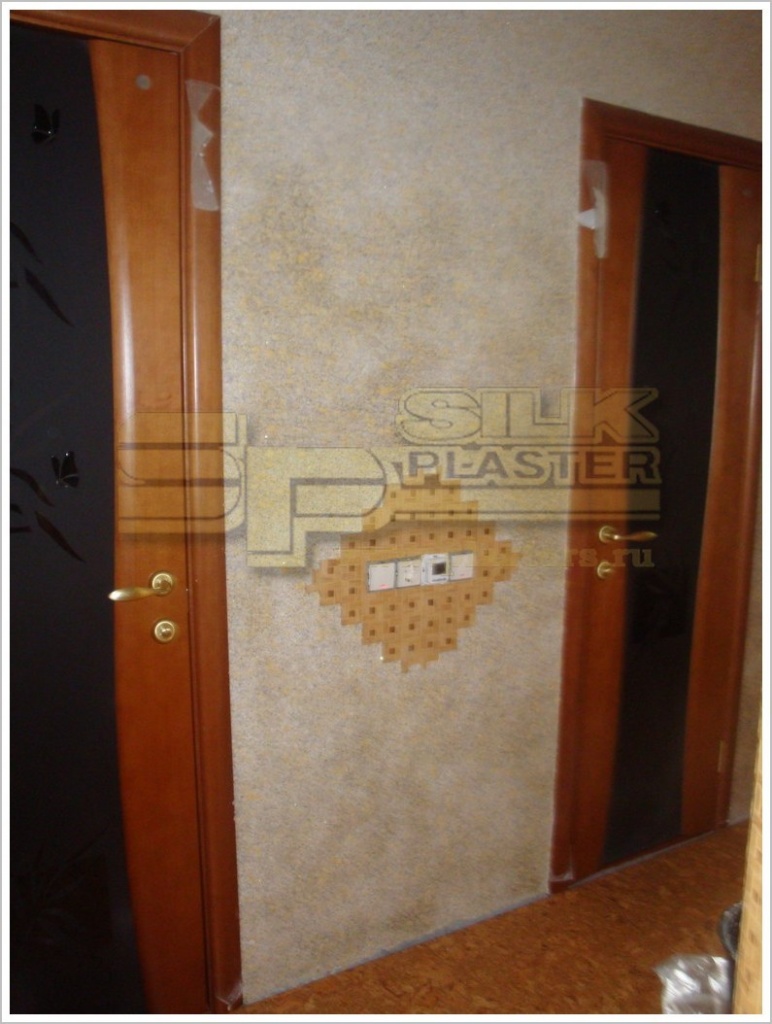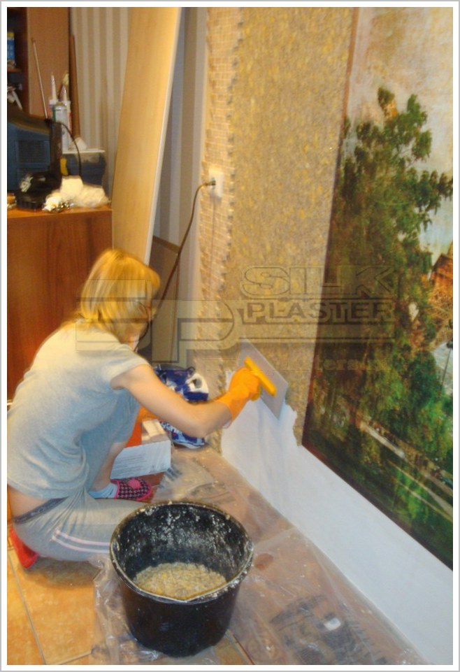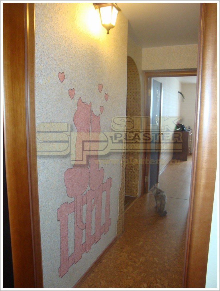 Ну, начну с самого начала. Возник вопрос, чем облагораживать нашу прихожую и коридорчик между спальнями. В прихожей у нас каменной мозаикой выложено пространство вокруг входной двери, наклеены фотообои, в коридорчике на небольшой площади целых четыре двери и закругленный угол, и мозаика из бамбука. Все это делало наклейку простых обоев довольно проблематичным делом. Стала искать варианты отделки. И вот, в Интернете прочитала про жидкие обои и загорелась этой идеей. Муж сказал: «Делай, что хочешь!» И я стала изучать в Интернете предлагаемый выбор жидких обоев. Особенно много хороших отзывов я прочитала про шелковую штукатурку Silk Plaster, поэтому остановила выбор на этой марке. Зайдя на официальный сайт, получила адрес официального представительства в нашем Нижнем Новгороде, прочитала про все необходимые инструменты и выбрала нужные нам обои. Посмотрев видео в Интернете про удивительные возможности Silk Plaster, мы тоже захотели сделать рисунок на стене из жидких обоев. Из многих вариантов выбрали парочку кошек, сидящих на заборчике. Ну, все, товар заказан, получен. И принялась за дело. Все оказалось проще, чем казалось сначала.