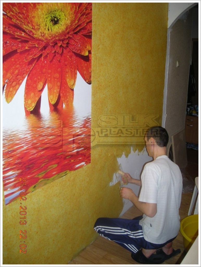 Выбрал время пришел по указанному подругой адресу, и уже через час был твердо уверен, что у меня ВСЕ ПОЛУЧИТСЯ!!! Жидкие обои Silk Plaster потрясающая вещь, всех их достоинства перечислять не буду, но отмечу главное для меня, они классно вписались в маленькую кухню, цвет у них сочный и фото-обои (небольшой фрагмент) легко совмещать – не нужно ничего выдумывать, резать.
